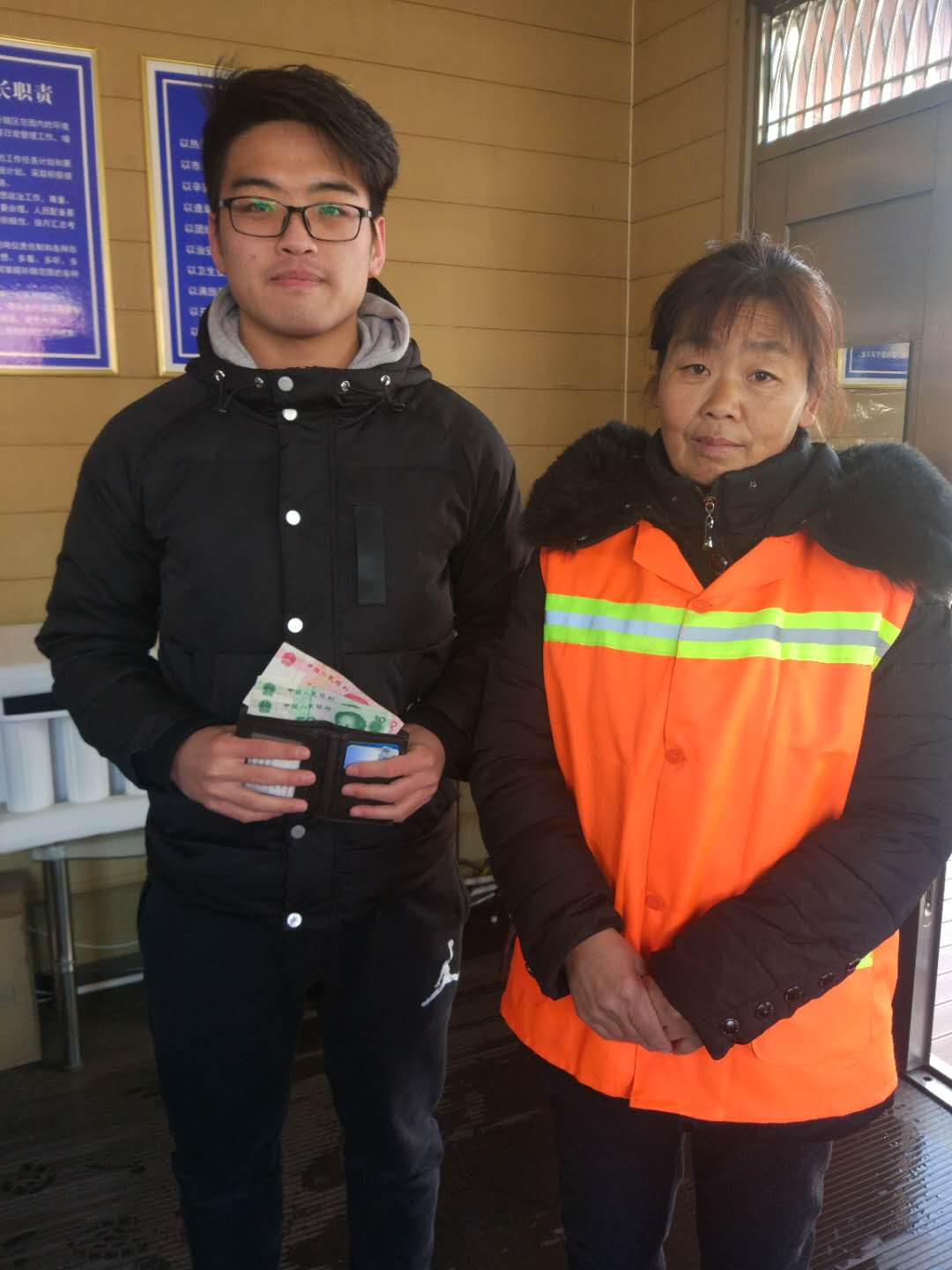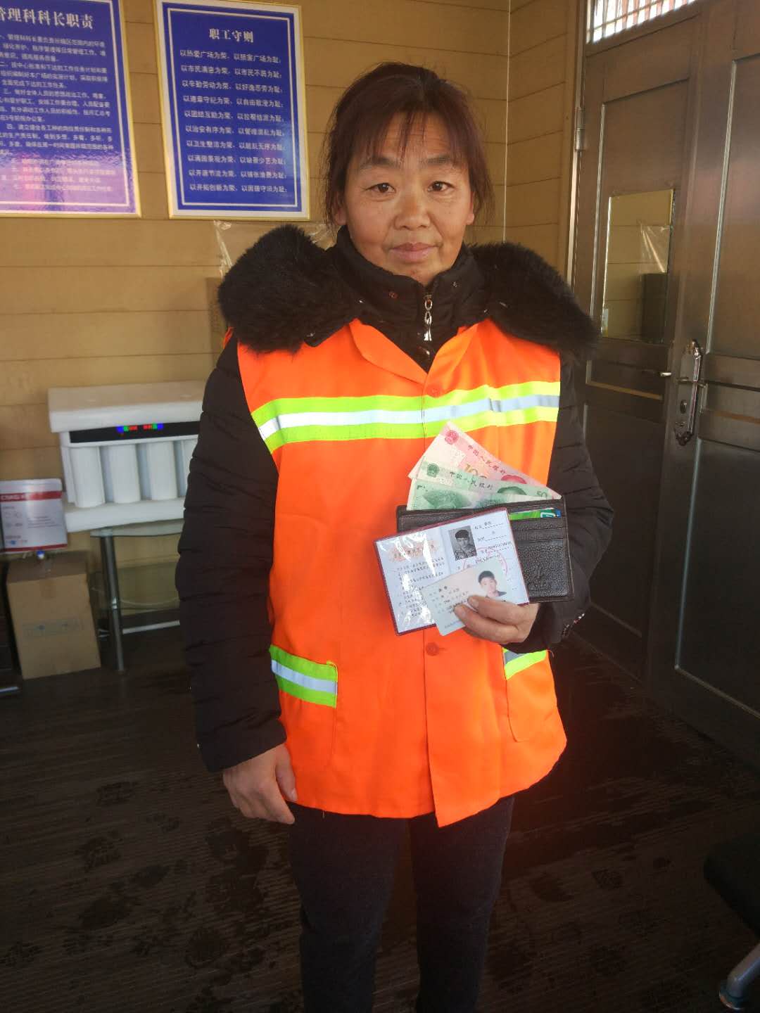 今年131日,我公司人民廣場(chǎng)保潔點(diǎn)的保潔員武彩霞在清理衛(wèi)生時(shí),撿到一個(gè)男士錢(qián)包,內(nèi)有身份證、學(xué)生證、數(shù)張現(xiàn)金,多張銀行卡等貴重物品,考慮到失主丟失物品的焦急的心情,武彩霞迅速將這一情況報(bào)至其主管處,并通過(guò)努力最終找到了失主,將錢(qián)包歸還失主。失主在取回自己的錢(qián)包時(shí),非常激動(dòng)的說(shuō):“謝謝,謝謝”。