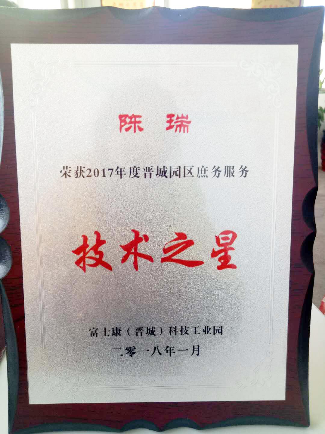 近日,在富士康(晉城)科技工業(yè)園舉辦的2017年度晉城園區(qū)庶務服務年終評比中,我公司員工陳瑞榮獲“技術之星“的稱號,這份榮譽是陳瑞總結日常工作所得經(jīng)驗再加上自身的刻苦鉆研,勤勞肯干的精神取得的。