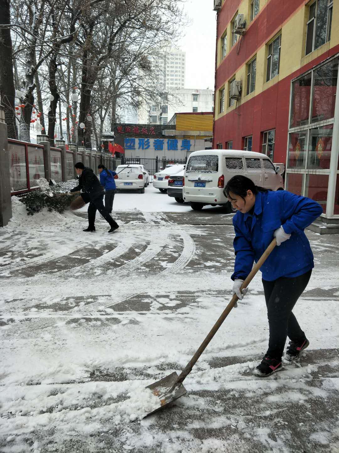 公司管理人員積極組織各項(xiàng)目點(diǎn)員工進(jìn)行主干道路面清雪(左上圖為晉城職業(yè)技術(shù)學(xué)院、右上圖為太原體彩中心)