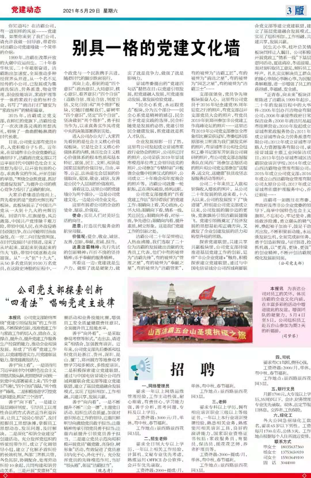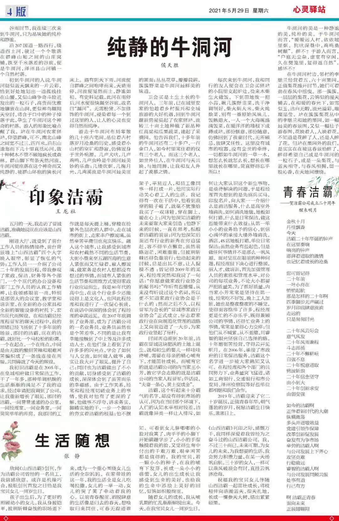 今天是2021年5月29日,經(jīng)過一個多月的緊張籌辦,《山西潔霸》報紙終于創(chuàng)刊啦!這是潔霸人的一件大喜事,也是潔霸人的驕傲!伴隨著《山西潔霸》紙質(zhì)版的內(nèi)部發(fā)行,電子版也同步與你見面了。希望你能通過這個宣傳窗口,更好地走近潔霸,了解潔霸,關(guān)注潔霸,支持潔霸。