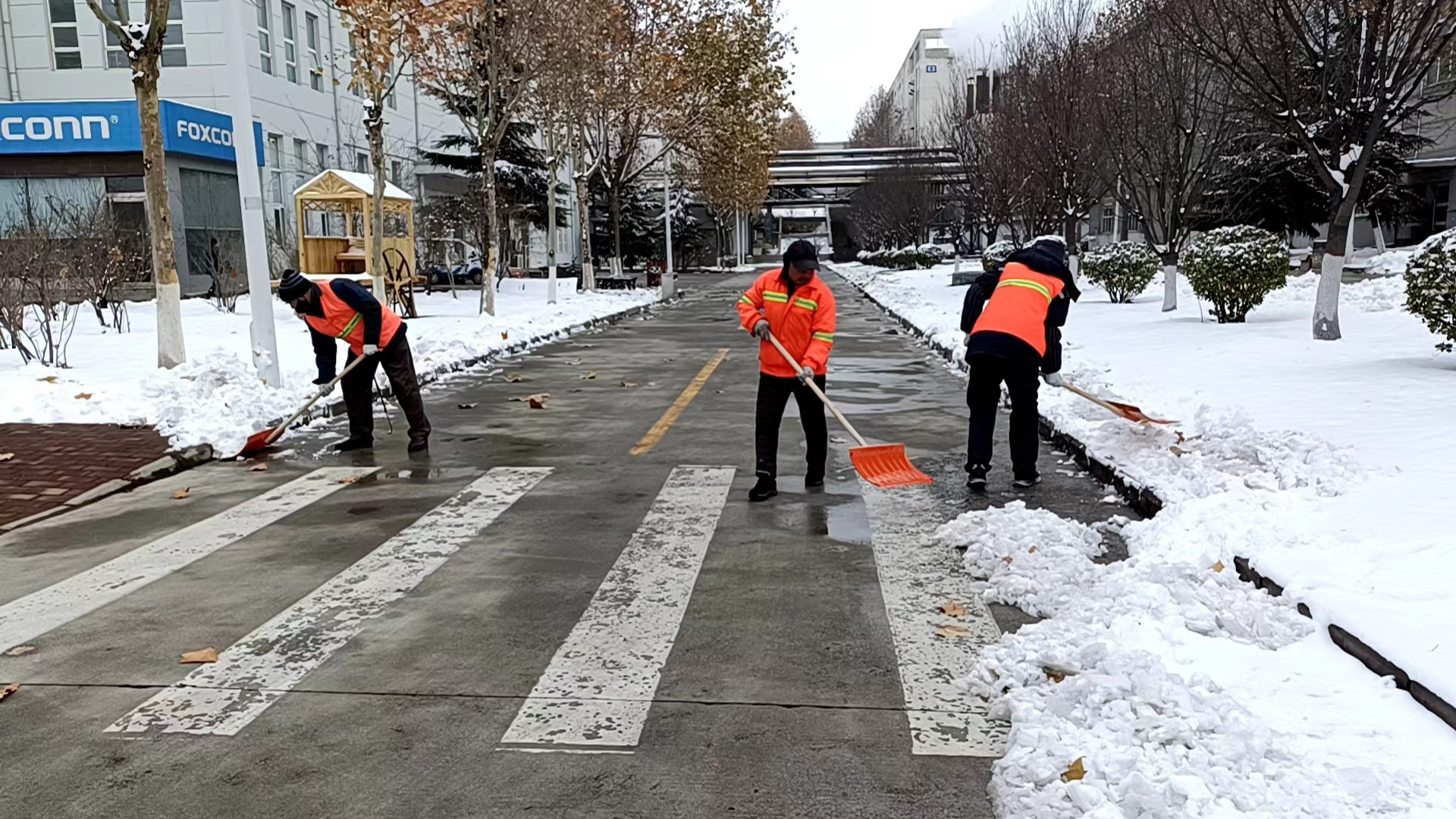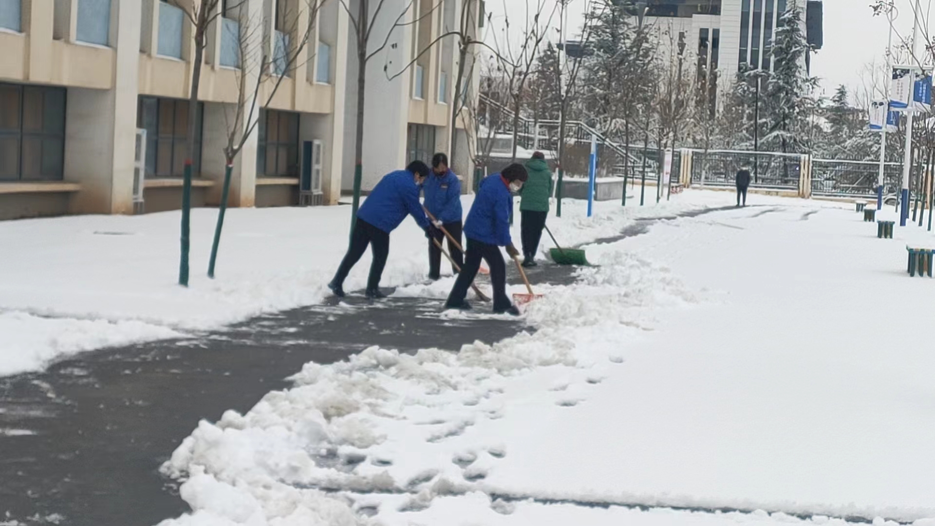 為保障群眾的安全以及道路的通暢,為廣大市民提供一個(gè)安全、便捷的出行環(huán)境,11日一大早,公司各個(gè)項(xiàng)目部、單位服務(wù)點(diǎn)的員工以雪為令,聞雪而動(dòng)積極行動(dòng)起來,投身到清掃積雪的活動(dòng)中。下雪后的天氣雖然寒冷,但也無法阻擋大家掃雪的熱情,同志們個(gè)個(gè)干勁滿滿——有的用除雪鏟推,有的拿鐵鍬鏟,有的拿笤帚掃……大家分工明確,配合默契,各個(gè)掃雪現(xiàn)場(chǎng)都是熱火朝天,為群眾安全出行開辟出了一條“暖心路”。充分彰顯了潔霸服務(wù),展示了潔霸形象。