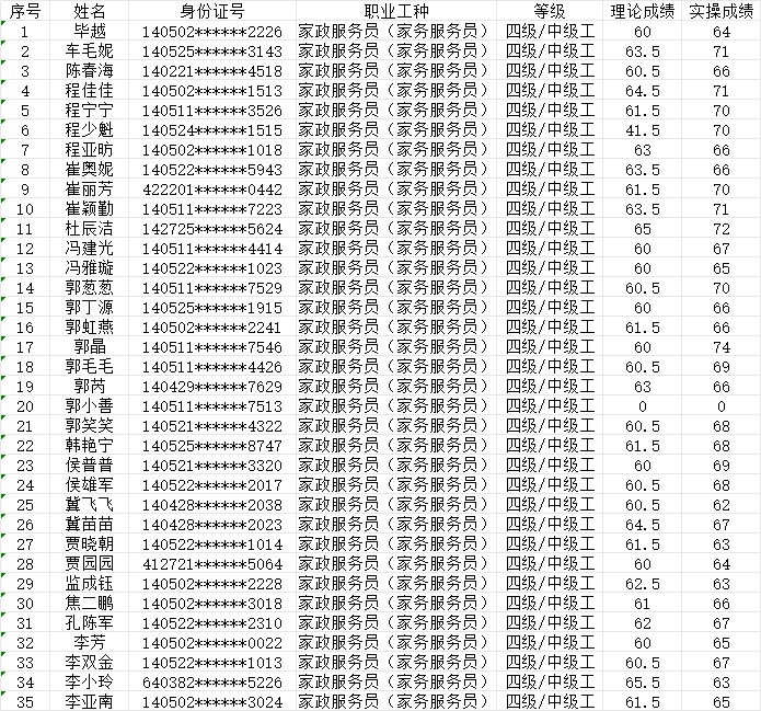 晉城市潔霸清潔服務(wù)股份有限公司職業(yè)技能等級認定中心2024年1月14日第1批家政服務(wù)員中級認定人員成績公示