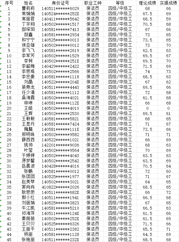 晉城市潔霸清潔服務股份有限公司職業(yè)技能等級認定中心現(xiàn)將2024年1月27日下午認定人員成績公示如下: