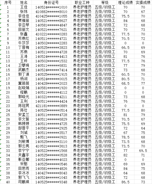 晉城市潔霸清潔服務(wù)股份有限公司職業(yè)技能等級認(rèn)定中心2024年7月14日第21批養(yǎng)老護(hù)理員初級認(rèn)定人員成績公示