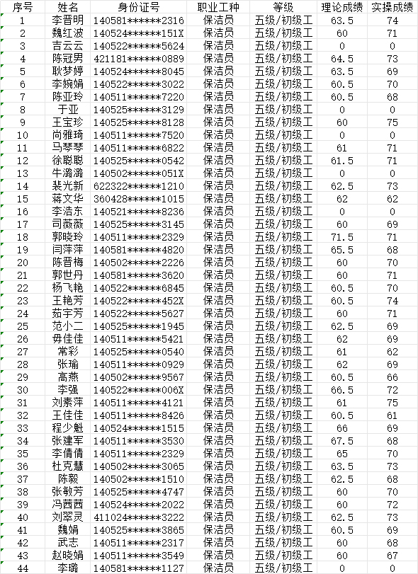 晉城市潔霸清潔服務(wù)股份有限公司職業(yè)技能等級認(rèn)定中心2024年7月21日第23批保潔員初級認(rèn)定人員成績公示